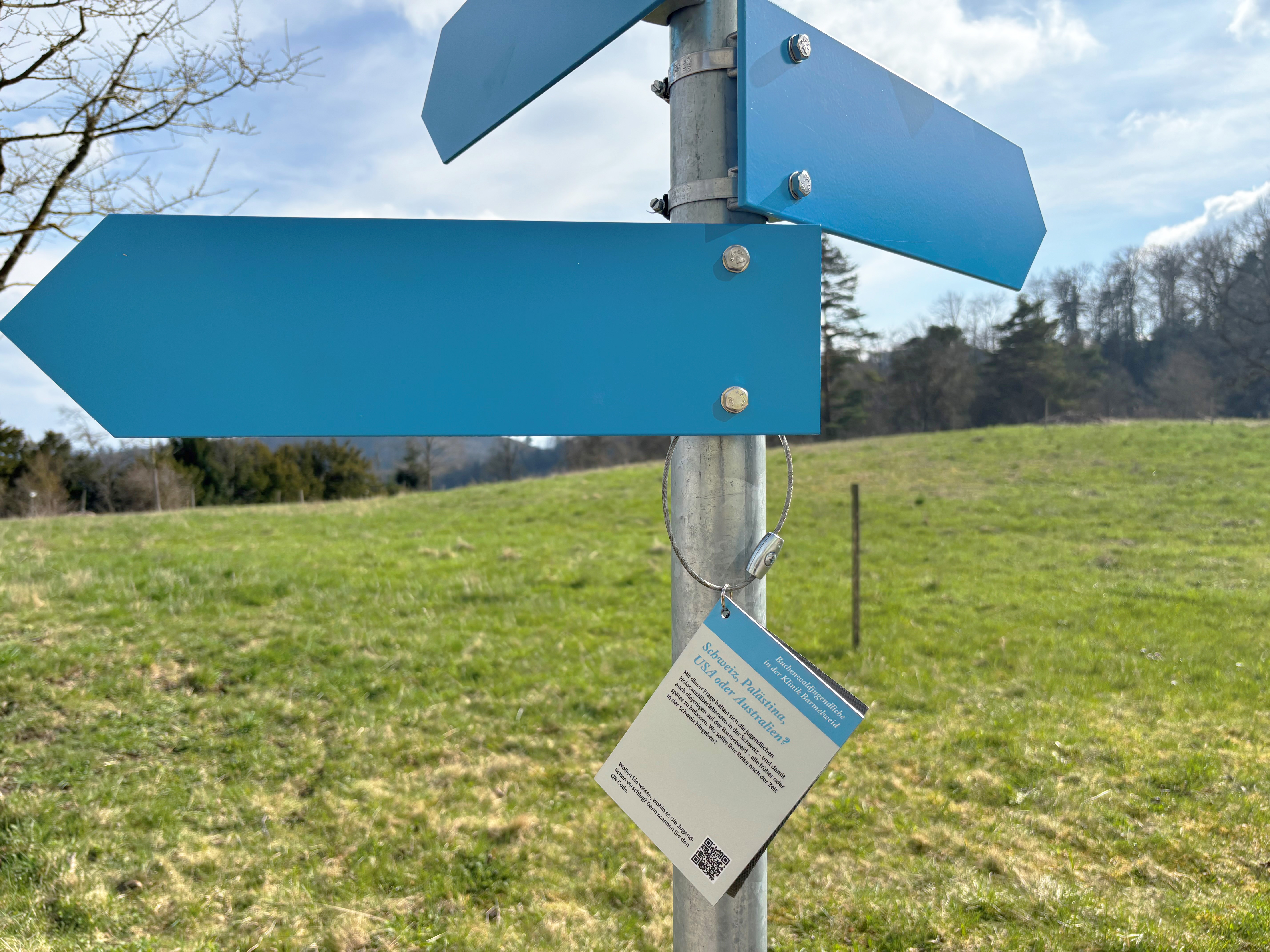 Nach der Befreiung von ungefähr 1'000 überlebenden jüdischen Jugendlichen aus dem Konzentrationslager Buchenwald am 11. April 1945 nahm die Schweiz vorübergehend 374 von ihnen auf. An Lungenerkrankungen leidende Jungen kamen zum Teil auf die Barmelweid. Zehn von ihnen konnten in intensiven Recherchen aufgespürt werden. Sie sind die Hauptpersonen im Projekt «Jugendliche aus Buchenwald», das durch blau eingefärbte Alltagsgegenstände an verschiedenen Orten auf der Barmelweid sichtbar wird.